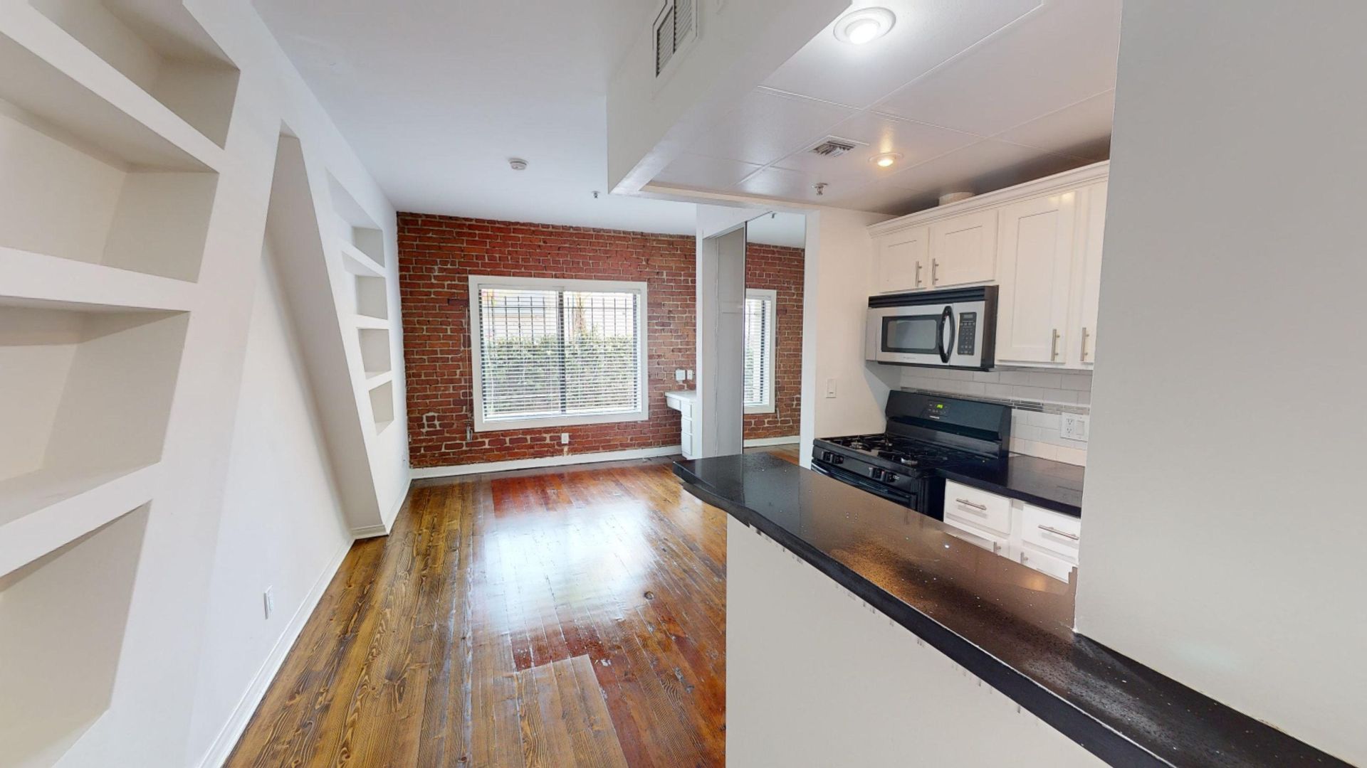 These apartment homes feature modern kitchens with stainless steel appliances, sinks, and faucets. Exposed brick walls add character and charm to select apartment homes at Burnside Villas Apartments.