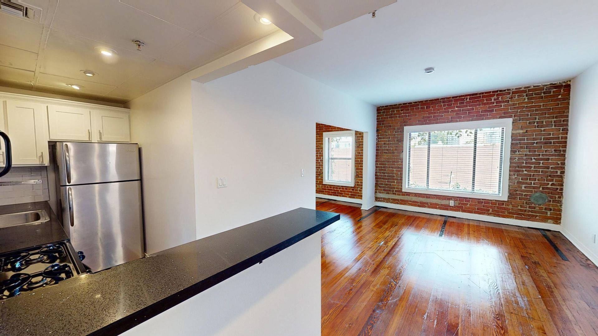 These apartment homes feature modern kitchens with stainless steel appliances, sinks, and faucets. Exposed brick walls add character and charm to select apartment homes at Burnside Villas Apartments.
